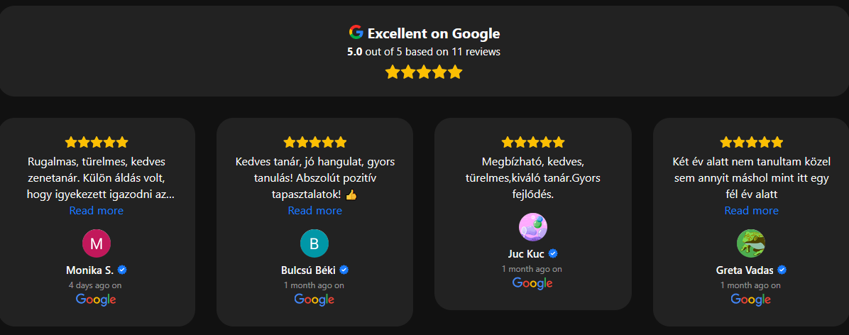 A 3. kerületben, 7 év tanítási tapasztalattal, okleveles zeneművészként tartok gitár-, és zongoraórákat kezdőknek és haladóknak. A legnagyobb szakértelemre való törekvés mellett rugalmasan, a tanulóhoz igazodó stílusban zajlanak a 60 perces alkalmak, legyen szó örömzenélésről, korrepetálásról vagy felkészítésről.